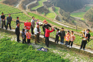 不一会儿,浩浩荡荡的娶亲队伍沿着田埂走过来了。看见路边摆放的东西,他们就在衣服上面留下了糯米饭、鸡肉之类的食物。