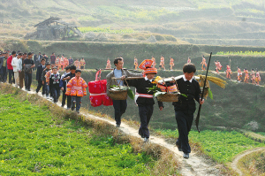 婚礼那天,娶亲队伍必须很早就上路。领头的是娶亲人(必须是家庭条件好、有威望的成年男子),他要带上一支鸟枪或一把古战刀,一方面表明“我是来娶亲的”,同时也是为了避邪保平安。而这刀、枪会在进门后由女方家接下,仪式结束后再退还。